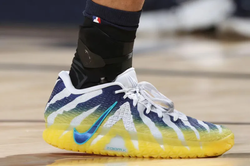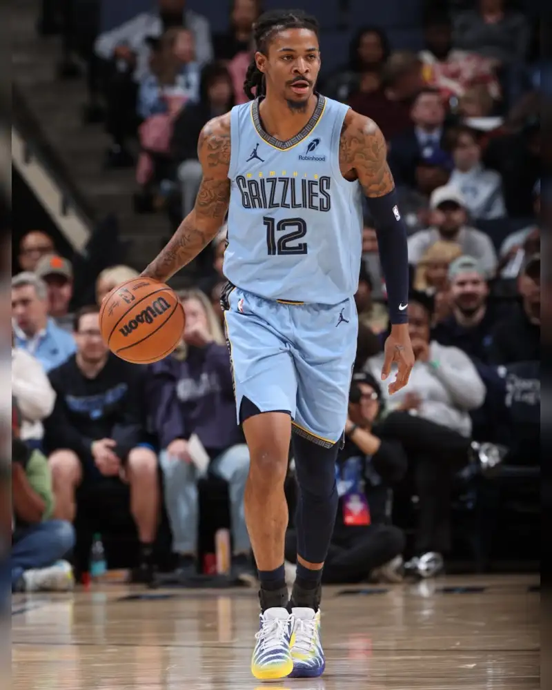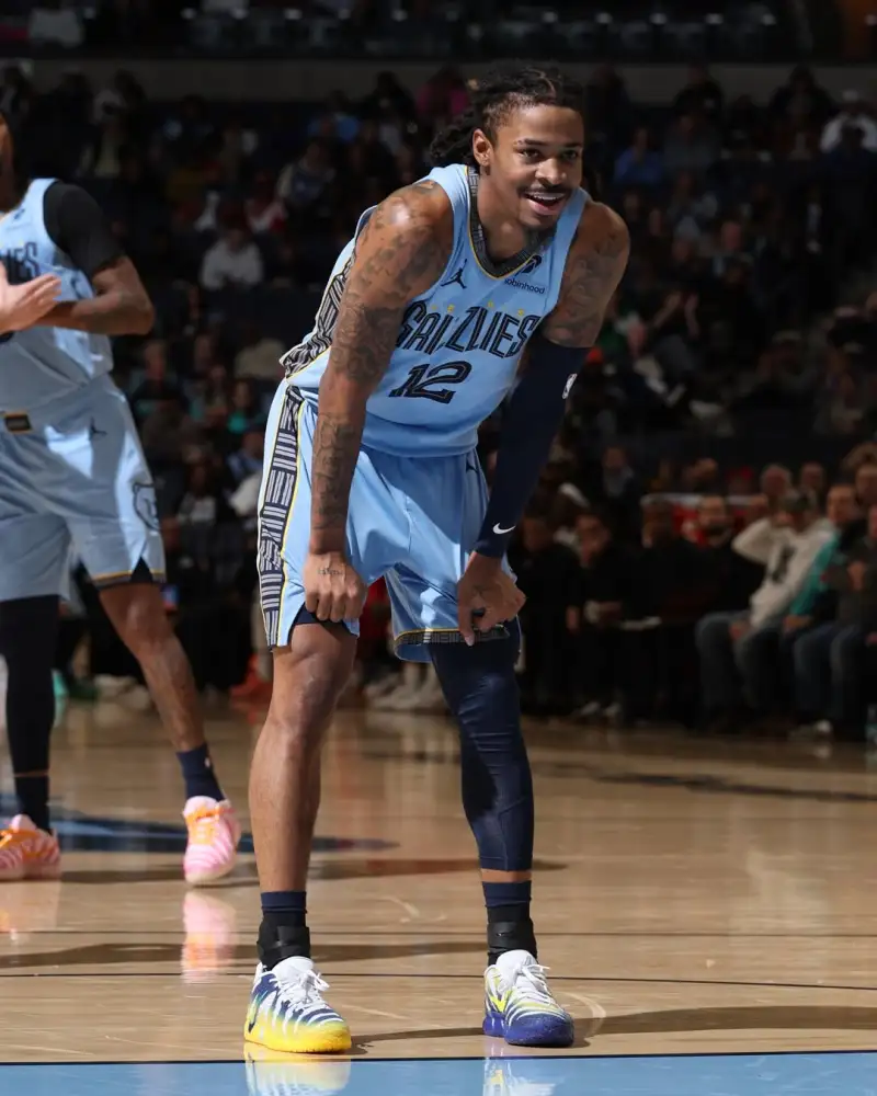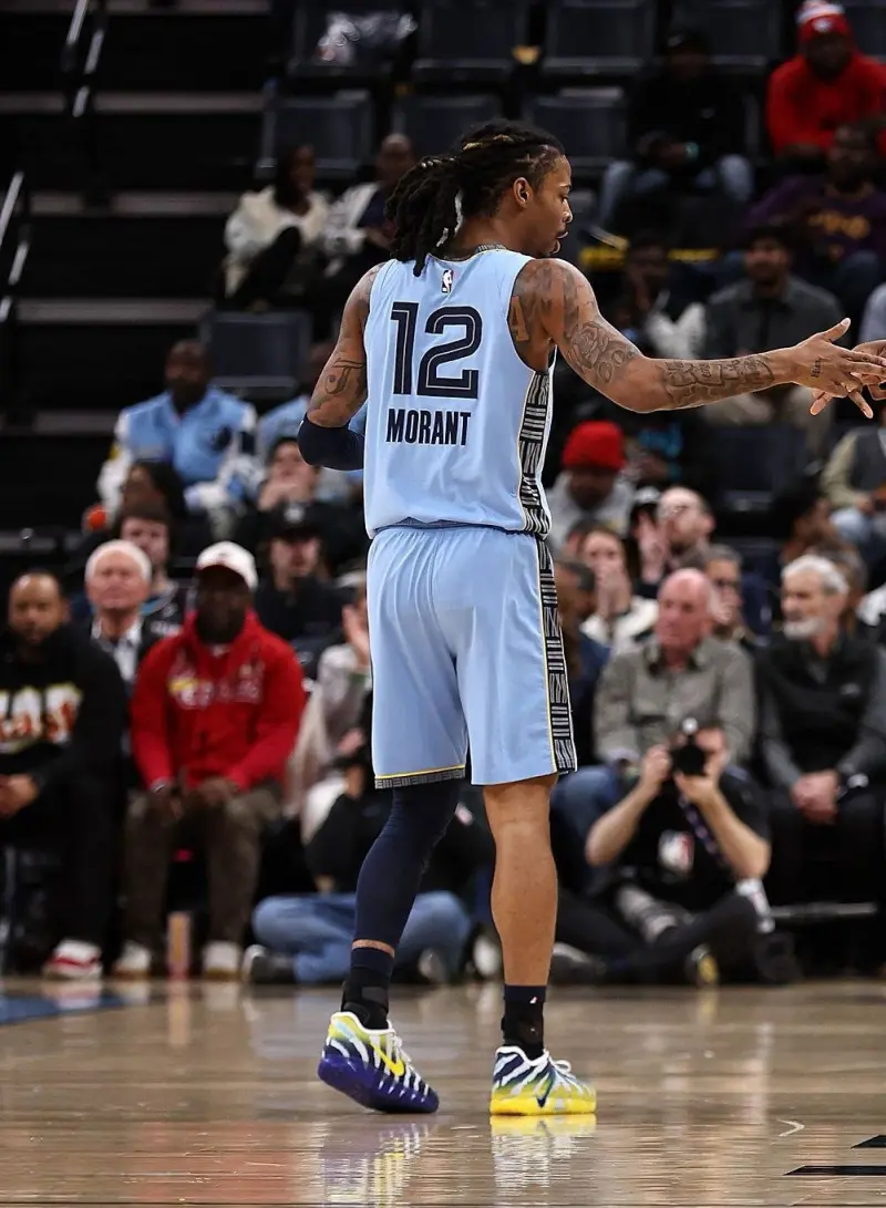 比赛中,莫兰特上脚母校莫瑞州立大学配色Nike JA3“Murray State University”。